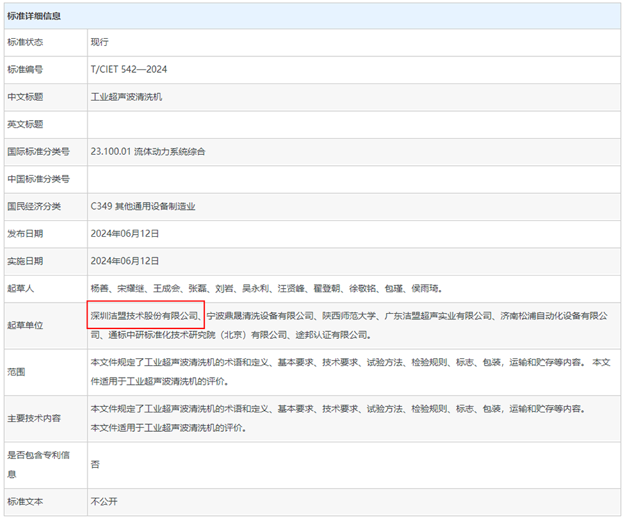 潔盟集團是一家致力于工業清洗設備研發、生產和銷售的高新技術企業。多年來,集團憑借其在超聲波清洗技術領域的深厚積累,不斷推出創新產品,滿足不同行業客戶的清洗需求。在標準的起草過程中,集團的專家團隊深入研究行業相關專利和標準,結合實際生產和使用情況,提出多項建設性的意見和建議,展現了其在行業內的領先地位和技術實力。